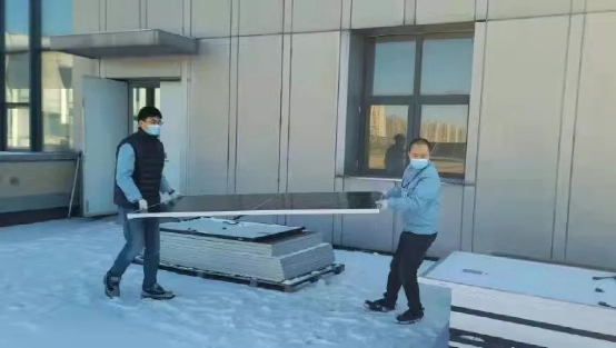 電科能源(18所)檢測中心職工不畏風雪搶抓任務進度,面對客戶希望將電站組件送樣進行戶外性能和老化測試的要求,檢測中心骨干黨員身體力行,帶領團隊頂風冒雪,爭分奪秒進行戶外測試。